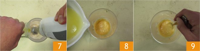 To make the mayonnaise, start by emulsifying the cooking water 7, slowly pouring in the extra virgin olive oil little by little 8, until you achieve a smooth and thick consistency 9.
