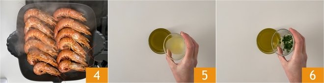 and let them cook over high heat for 3 minutes, then turn them over 4 and continue cooking for another 3 minutes. In the meantime, prepare the dressing. In a small bowl, pour the oil, the lemon juice 5, and the chopped parsley 6.