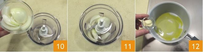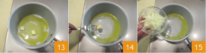 Sauté the garlic for a few minutes, so that the oil is well flavored 13. When it is golden, remove it 14 and add the chopped onion 15.