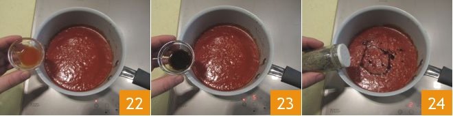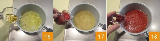 Let it stew for about 10 minutes, gradually adding the vinegar 16 and letting it evaporate. Keeping the heat very low, add all the other ingredients one by one: first the tomato sauce 17, then the paste 18,