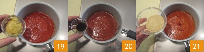 then the mustard 19, the chili pepper 20, the brown sugar 21, always stirring as you add a new ingredient.