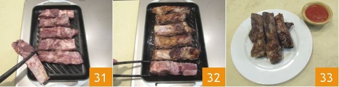 and cook them on a very hot grill 31 for about 20 minutes, or until they are cooked, turning them halfway through cooking 32. Serve your grilled ribs hot, accompanied by the previously prepared sauce 33.