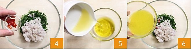 and the chopped chili pepper. Set aside the mixed chop. Now take care of the dressing sauce: in a small bowl, pour the oil, lemon juice 5, and two tablespoons of apple cider vinegar. Whisk the sauce well and incorporate it into the prepared chop 6,
