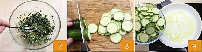 mix well so that the chop absorbs the dressing 7 and season with salt and pepper. Set the sauce aside and take care of the zucchini side: wash and cut the zucchini into rounds 8. In a large pan, place the chopped garlic (or if you prefer, you can leave it whole and then remove it after it has flavored the oil) and four tablespoons of oil, let it wilt, and add the zucchini, salt, pepper