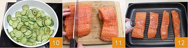 (you can consult the procedure found in the sautéed zucchini recipe) and cook over high heat, covering the pan with a lid until the zucchini is cooked 10. Finally, prepare the salmon: take the cleaned salmon fillet and cut it into 4 slices of about 7 oz each 11. (Alternatively, you can buy 4 pre-cut slices at the fishmonger). Heat a cast-iron grill, once it's hot, place the slices, salt 12,