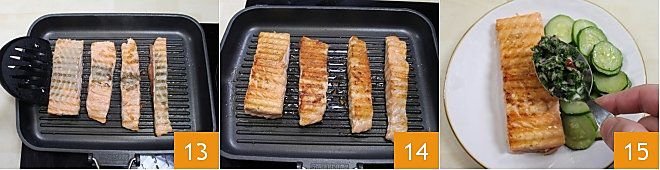 pepper, and cook for about 3-4 minutes per side 13. The slices will be ready when the surface is golden 14. Now you can plate 15: drizzle the salmon with the parsley sauce prepared earlier and add the sautéed zucchini. Serve the grilled salmon with parsley sauce hot.