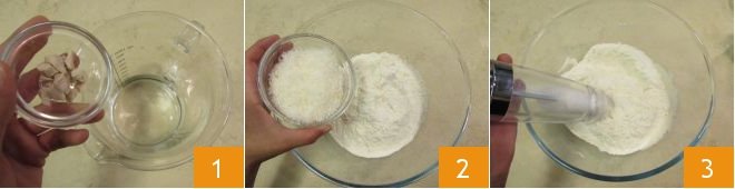 To prepare Grana Padano breadsticks, first dissolve the yeast in water by stirring with a spoon 1. Pour the flour and grated Grana Padano PDO into a bowl 2 and salt 3.