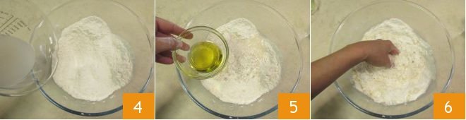 Gradually pour in the water in which you dissolved the yeast 4 and also incorporate the olive oil 5. Mix with your hands to blend the ingredients and absorb the liquids 6.