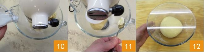Start the stand mixer at medium speed and begin to add the room temperature milk gradually 9. When all ingredients are combined, remove the paddle and replace it with the dough hook: add a pinch of salt and start kneading at medium speed. At this point, gradually add the softened room temperature butter: add a piece 11 and once absorbed, continue with another. The dough should be elastic and wrap around the hook. Remove the dough from the mixer, shape it into a ball, and place it in a bowl covered with plastic wrap, letting it rise in the oven with the light on for about 3 hours or until it doubles in volume.