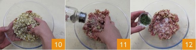 Knead everything together with your hands 10 and season with salt and pepper 11. Finely chop the rosemary and incorporate it into the mixture 12.