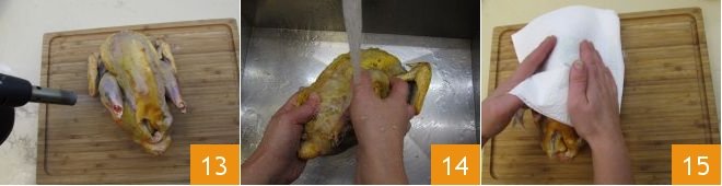 Set the stuffing aside for a few minutes and take care of the guinea fowl. Singe the guinea fowl to remove any feathers or down 13; we used a blowtorch, but if you don't have one, you can hold the guinea fowl close to a gas flame for a few seconds. Then rinse it under running water 14 and pat it dry with paper towels 15.