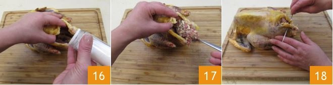Season the inside of the guinea fowl with salt and pepper 16. Then, using a spoon, stuff it with the sausage and chestnut filling 17. Sew up the opening 18 using a kitchen needle or the thickest needle you have and some kitchen string. This will seal it completely and prevent the stuffing from coming out during cooking.
