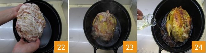 Then cut off the excess string 19 and wrap the guinea fowl with bacon 20. Finally, tie it all with string 21, like a roast, to keep the bacon in place.