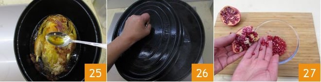 and continue cooking for another 90 minutes, basting it occasionally with its liquid 25 and covering it with a lid 26. When the guinea fowl is almost cooked, prepare the accompanying sauce. Cut the pomegranate in half and start to deseed it 27, setting the seeds aside.