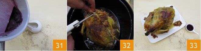 Once you have a fairly thick sauce, pour it into a sauceboat 31 and retrieve the now-cooked guinea fowl. Remove the outer string by cutting it with scissors 32 and serve your guinea fowl stuffed with chestnuts still hot, accompanied by the pomegranate sauce 33.