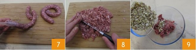 At this point, take the sausage and remove the casing 7; to do this, simply make a cut in the center of each sausage and gently pull it off with your hands. Coarsely chop this as well 8 and transfer it to a bowl along with the chestnuts 9.