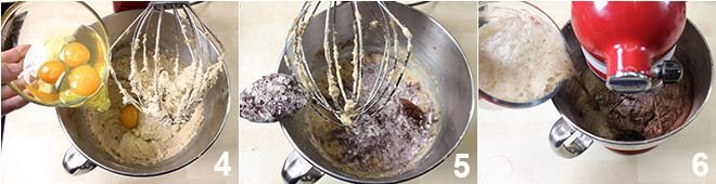Add the eggs one at a time 4 and continue mixing until they are well incorporated into the mixture. Add the dry ingredients one tablespoon at a time 5, until you obtain a smooth and creamy batter. Finally, add the Guinness beer in a thin stream 6 and stir.