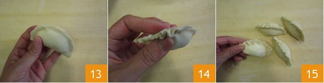 Then, using your fingertips, fold the ravioli into a half-moon shape 13, pinching the dough along the sealing line to secure the filling inside and give the ravioli its typical dumpling appearance 14. Proceed in the same way with all the ravioli 15.
