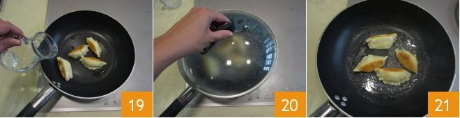At this point, pour a drizzle of oil into a pan 16 and let it heat. Add the dumplings to the pan 17 and wait a few seconds before turning them. They should be well browned 18.
