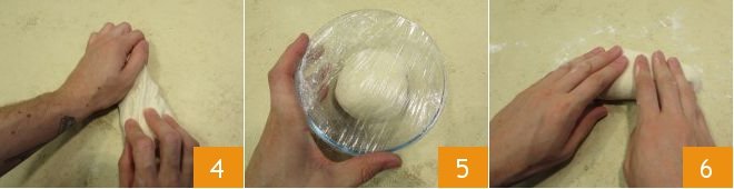 Transfer to a work surface and knead quickly 4. Form a ball, place it in a bowl, and cover with plastic wrap 5. Let it rest for about half an hour at room temperature. After this time, transfer the dough to a lightly floured work surface 6.