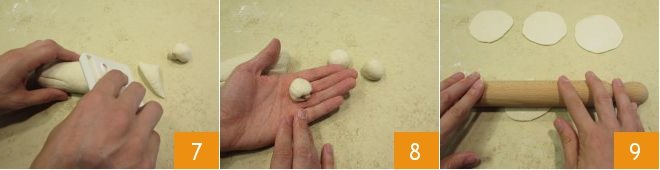 Using a dough scraper, divide the dough into 16 pieces, each weighing 0.63 oz 7. Form them into equally sized balls 8. Keeping the remaining balls covered with plastic wrap to prevent them from drying out, take a rolling pin and roll each ball into a disc about 1/8 inch thick 9. To give them a regular shape, you can cut them with a 3.5-inch cutter.