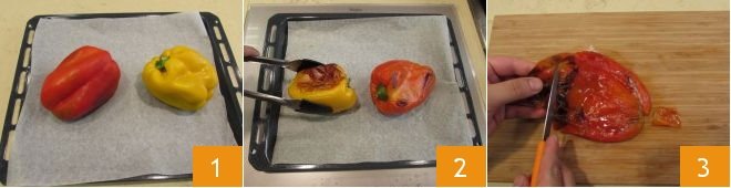 To prepare the half sleeves with peppers and zucchinis, first wash and cook 2 whole peppers in a static oven preheated to 482°F, for about 30-40 minutes 1. When they are halfway through cooking, turn them with the help of kitchen tongs 2. Once cooked, peel them using a knife 3,