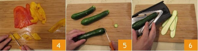 then cut them into pieces 4 and set aside. Then, focus on the zucchinis: wash them, trim them 5, then slice them about 1/8 inch thick using a mandoline 6.