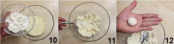 Once the pea velouté is ready, proceed to make the cheese balls: in a bowl, combine the ricotta and Parmesan 10 and mix the two cheeses with a spoon until you get a homogeneous mixture 11. Then take a teaspoon of the mixture and shape it into a nice round ball with your palms 12