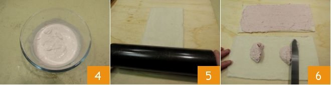 You should obtain a smooth and homogeneous cream 4. Now take a slice of bread and lightly flatten it with a rolling pin 5, then spread a layer of ham cream over the entire surface 6.