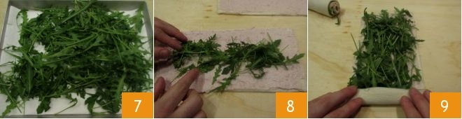 Take the well-washed and dried arugula 7 and distribute it over the slice of bread so as to cover the entire layer of cream 8, then begin to roll the bread onto itself starting from the short side 9. You will get cylindrical rolls weighing about 2.5 oz each.