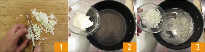 To prepare the ham croquettes, finely chop an onion 1. Melt the butter in a saucepan 2 and stew the onion for 10 minutes over medium-low heat 3.