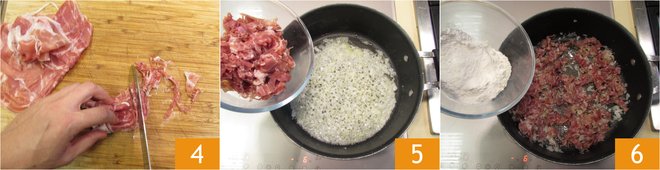 Meanwhile, cut the ham into strips 4, add it to the pan 5, and cook for 1 minute. Add the flour all at once 6 and toast it for 2 minutes.