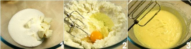 To prepare the harlequin cake, combine the sugar, vanilla bean seeds, and softened butter 1 in a bowl and mix them with an electric mixer. Add the whole eggs 2 at room temperature one by one until they have a creamy consistency 3.