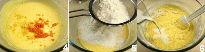 While continuing to mix, add the lemon and orange zest 4 and mix. Then add the flour 5, previously sifted baking powder and potato starch, and mix well. Subsequently, pour the milk at room temperature into the batter 6.