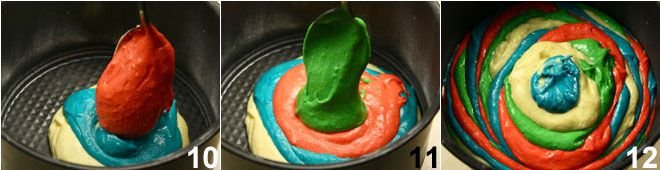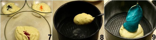 Divide the obtained batter equally into four bowls; leave one with the natural batter and add a pinch of food coloring 7 of different colors to the other three, preferably in powder form. For example, use red, blue, and yellow coloring and mix the powders to obtain different colors. Butter and flour a 7-inch cake pan with high edges (a panettone mold), place a tablespoon of batter in the center 8, then overlap another tablespoon of batter of another color 9 on top of the first one,