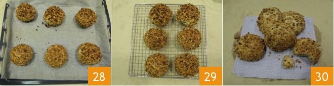 Then remove the buns and heat the oven in static mode to 428°F, placing a pot filled with water at the base; bake the tray of hazelnut buns for 15 minutes at the indicated temperature. After this time, remove the pot from the oven, being careful not to burn yourself, and reduce the temperature to 392°F; continue baking for another 5 minutes, wedging an oven mitt between the oven door and its frame to simulate the open oven valve. When they are golden brown, remove the hazelnut buns 28 and let them cool on a wire rack 29 before serving them 30.