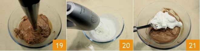 After the necessary time, take the hazelnut cream again and with an immersion blender, whip it to smooth the mixture 19; whip the fresh cream in a bowl with well-chilled beaters 20, then add it to the hazelnut cream, mixing with a soft spatula from top to bottom so as not to deflate it 21: your filling is ready.