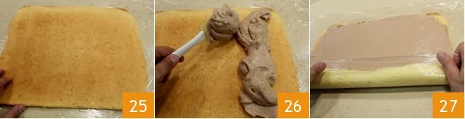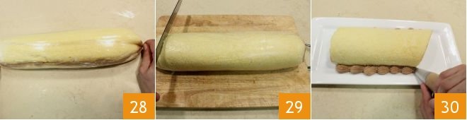 flip the sponge cake onto the cling film and remove the other sheet of parchment paper: the dark side of the sponge cake should face up 25; fill the sponge cake with a layer of hazelnut cream 1/2 inch thick, leaving about 1/2 inch from the edge 26. When you have finished, roll the sponge cake with the help of the cling film, starting from the longer side in front of you 27. As you roll, remember to remove the excess film from the edges.