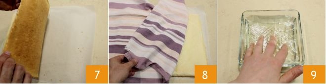 When the sponge cake is cool, remove the towel and the parchment paper layer 22, then pass a damp cloth over the work surface 23 and then lay out two sheets of cling film, which are 2 inches longer than the dimensions of the sponge cake, slightly overlapping 24.