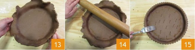 to obtain a disc about 1/4 inch thick and large enough to line a 9-inch removable bottom pan 13. Then trim the excess by pressing the rolling pin against the edges of the pan 14 and prick the base with a fork 15.