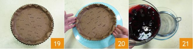 Once the base is baked, let it cool completely 19 before transferring it to a serving plate 20. Meanwhile, tend to the rest. Drain the sour cherries, collecting 100 g of syrup in a small bowl 21