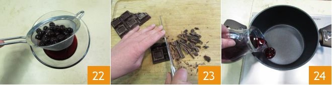then move the drained sour cherries 22 and chop the chocolate to prepare the ganache 23. In a small saucepan, pour the sour cherry syrup 24,