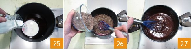 the cream 25, and heat almost to a boil. Then turn off the heat and immediately add the chocolate while stirring with a whisk 26. This way, the chocolate will melt with the still very hot temperature 27.