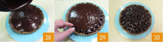 Pour the ganache over the pastry that you have meanwhile transferred to the serving plate, garnish with the sour cherries, and let set in the refrigerator for 6-8 hours 29. After the necessary time has passed for everything to set, your hazelnut tart with dark chocolate ganache and sour cherries will be ready to be enjoyed 30.