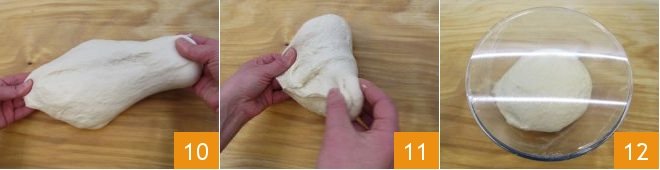 Then transfer the dough to a work surface. Stretch it slightly with your hands 10 then fold it by joining the ends 11. Repeat the operation a couple of times. Then shape the dough into a ball and let it rest in a bowl covered with plastic wrap for at least 2 hours in an oven turned off with the light on (at a temperature of 82-86°F) 12.