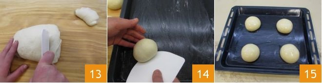 Afterwards, take the dough, place it on a work surface, and divide it into 4 parts of about 4.6 oz each 13. Work each piece until you form balls. Then take a baking sheet, and after buttering it, place the balls you have formed well spaced from each other 14. Let them rise for about 1 hour 15.