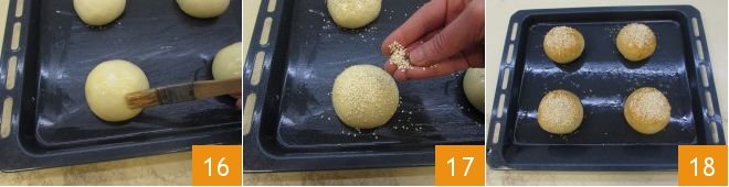 After the rising time, brush them with an egg 16 and decorate with sesame seeds 17: bake in a preheated static oven at 374°F for 20 minutes (or in a ventilated oven at 320°F for 10 minutes, in this case you can try baking 1 bun to better adjust the time and temperature). Then take the buns out of the oven and let them cool at room temperature 18. The buns are ready to be cut in half and stuffed!