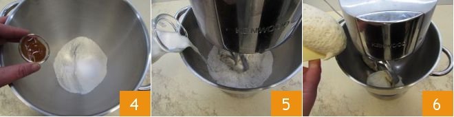 Then proceed with the dough: in a stand mixer, sift the flour, the dry yeast, and add the granulated sugar and malt 4. Turn on the stand mixer with the paddle at medium speed. Then pour in the milk at room temperature 5 and the water in a stream at room temperature. Once the liquids have been absorbed, gradually add the risen starter dough 6. Continue kneading for about 3 or 4 minutes until the dough is homogeneous.