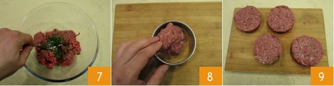 In a bowl, place the meat and add the chopped dill and chives. Season with salt and pepper. Using a fork or your hands, mix the ingredients well 7. Then take a pastry cutter with a diameter of 5 inches and place the chopped meat inside 8. Repeat the operation to obtain 4 hamburgers of about 3.9 oz each 9.