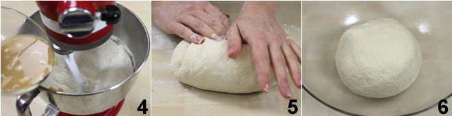 Put the flour in the bowl of a stand mixer equipped with a hook, turn on the machine and first add the yeast mixture 4 and then, little by little, the water, salt, and oil mixture. Knead until you get a smooth and elastic dough, then take it out of the bowl and, on a work surface, knead it for a few seconds to shape it into a sphere 5. Place the dough in a large bowl greased with a little olive oil 6, cover the bowl with plastic wrap and let it rise in a warm place for about two hours, until it doubles in volume.